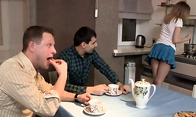 Naughty stepsister rubs her pussy on stepbrothers hard man sausage, do blowjob and then fucks him deep till hefty creampie!